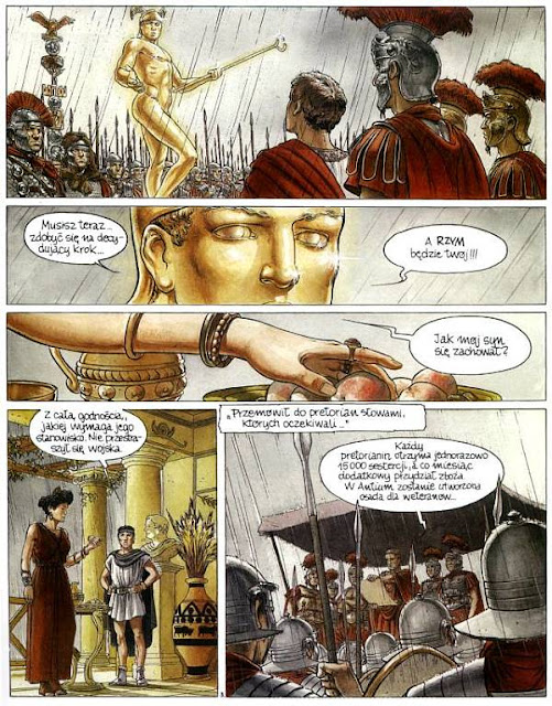 Mimo sporej dawki fikcji, opartej w dużej mierze na plotkach, jakie przetrwały w pracach wieszczów po dziś dzień, Komiks nadal zawiera olbrzymi ładunek historii. Oczywiście nadal nie można tu mówić o dziele dokumentalnym, jednak Dufaux umiejętnie wykorzystał swoją wiedzę aby dać czytelnikom naprawdę świetnie skonstruowany thriller polityczny, nie pomijając przy tym najważniejszych dla tamtego okresu wydarzeń. Dzięki temu nie odczuwa się braku jednej z ważniejszych dla tamtych wydarzeń postaci, a mianowicie pierwszej żony Nerona - Oktawii. Scenarzysta nie zapomniał o niej się wypowiedzieć w przypisach oraz nawiązał do niej w samej historii tego albumu, jednocześnie tłumacząc dlaczego zdecydował się na taki zabieg. Tym samym wyszedł z tego obronną ręką, przynajmniej w moich oczach, choć nadal uważam, że można było w całość wpleść tą tragiczną, jakby nie patrzeć, bohaterkę.